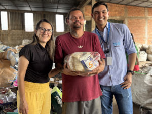 Na sequência, a equipe seguiu para a cooperativa Cooperlegis beneficiada, onde foram entregues 8 cestas básicas. Com 7 cooperados, a organização adota um sistema manual de separação, utilizando uma mesa ajustável, que permite a inclusão de pessoas com deficiência e respeita o ritmo individual de cada trabalhador.