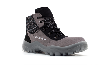 A Botina Evolution Cinza e Preto pode ser fabricada com biqueira plástica, de aço ou composite.