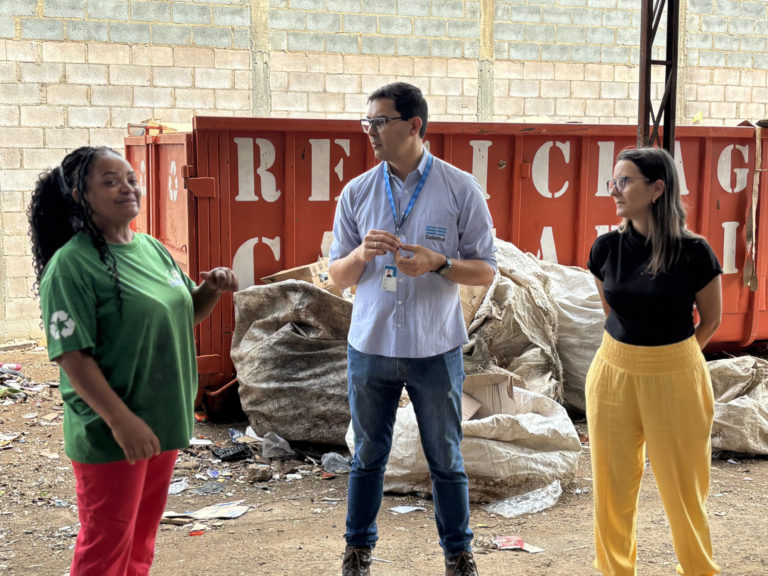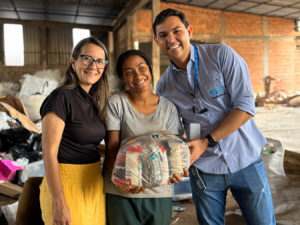 Na sequência, a equipe seguiu para a cooperativa Cooperlegis beneficiada, onde foram entregues 8 cestas básicas. Com 7 cooperados, a organização adota um sistema manual de separação, utilizando uma mesa ajustável, que permite a inclusão de pessoas com deficiência e respeita o ritmo individual de cada trabalhador.